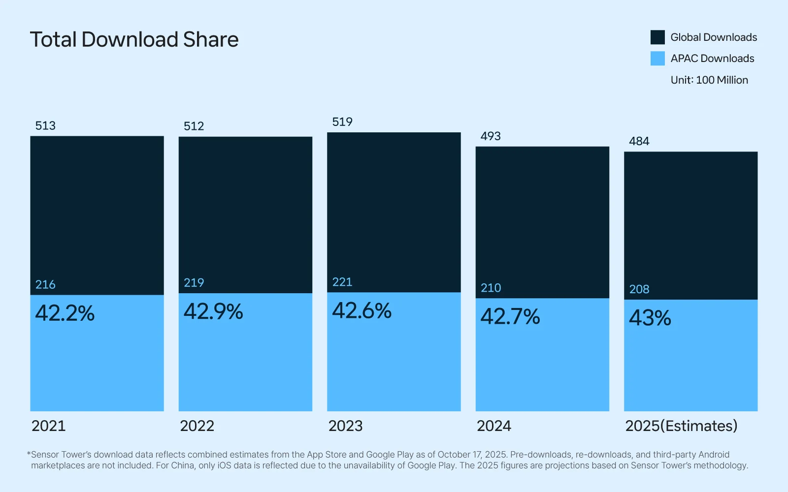 Over the past five years, the global mobile game market has entered a gradual adjustment phase following its rapid pandemic-era expansion. What is notable, however, is that APAC's share of total downloads has shown a slight increase despite the overall global downturn.