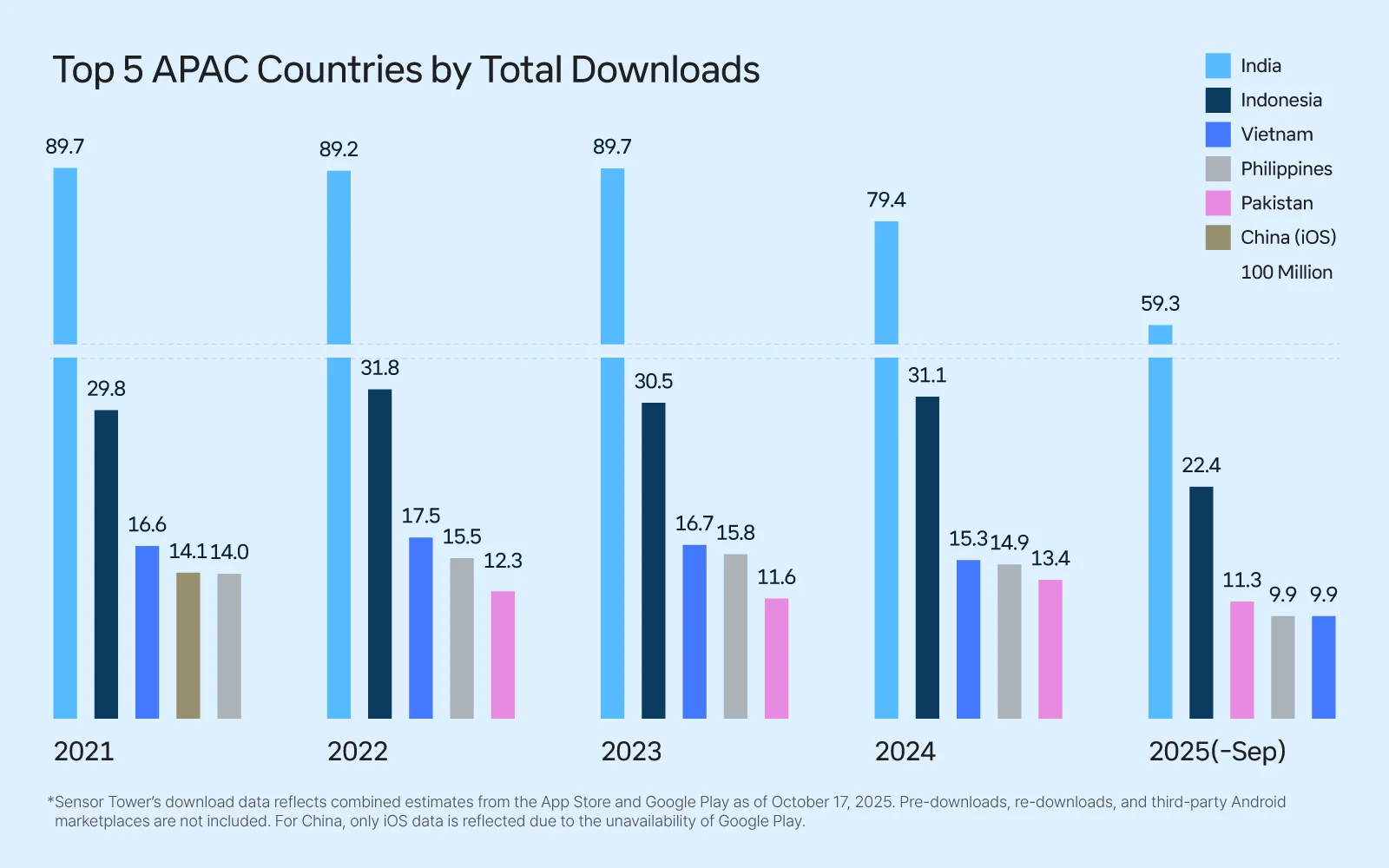 Notably, India and Indonesia have maintained their positions as the #1 and #2 download markets within APAC for five consecutive years, demonstrating stable market leadership. Pakistan has shown a rapid increase in downloads, entering the APAC top 5 for downloads and ranking in the top 3 for the first time in 2025.