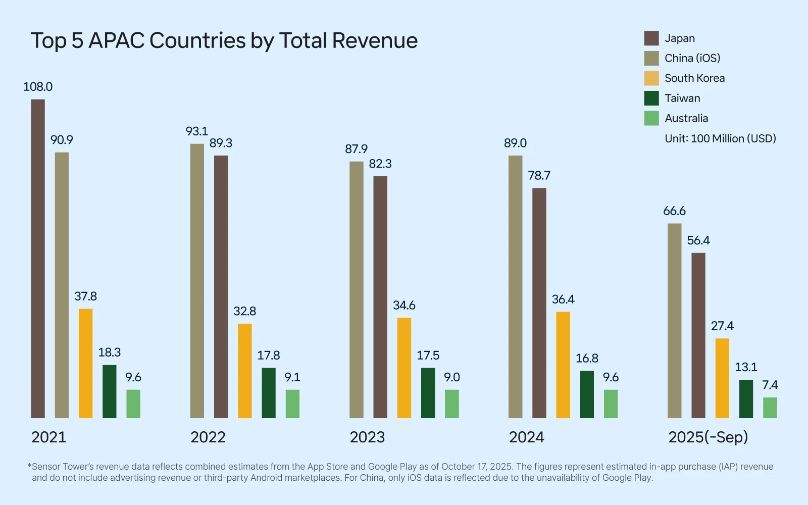 The APAC market is maintaining a stable revenue structure despite mild stagnation in high-expenditure countries. South Korea and Japan remain premium, content-driven markets with high purchasing power, serving as a critical high-profit base for global publishers.