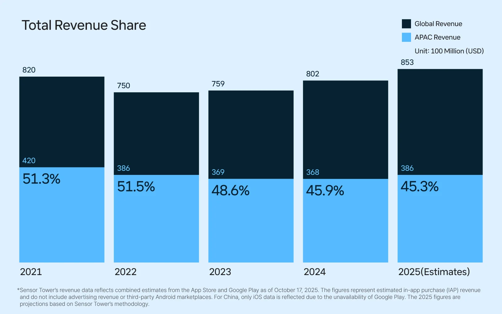 As of September 2025, global mobile game revenue reached approximately USD $61.0 billion, with the APAC market contributing USD $27.5 billion (45%). Although APAC's revenue share has seen a moderate decline from 51% in 2021 to 45% in 2025, the region has shown signs of recovery since 2023. With 2025 revenue expected to return to pre-pandemic levels, the market has clearly entered a stabilization phase post-adjustment.