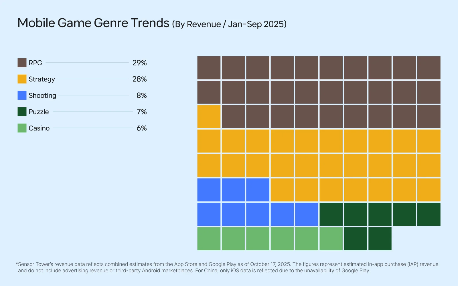 In 2025, RPG and strategy remain the two dominant revenue drivers in the APAC mobile gaming market. However, the RPG share has gradually declined from 41% in 2021 to 29% in 2025. Meanwhile, the Strategy genre reached a five-year high of 28% and surpassed RPG revenue during three different months.