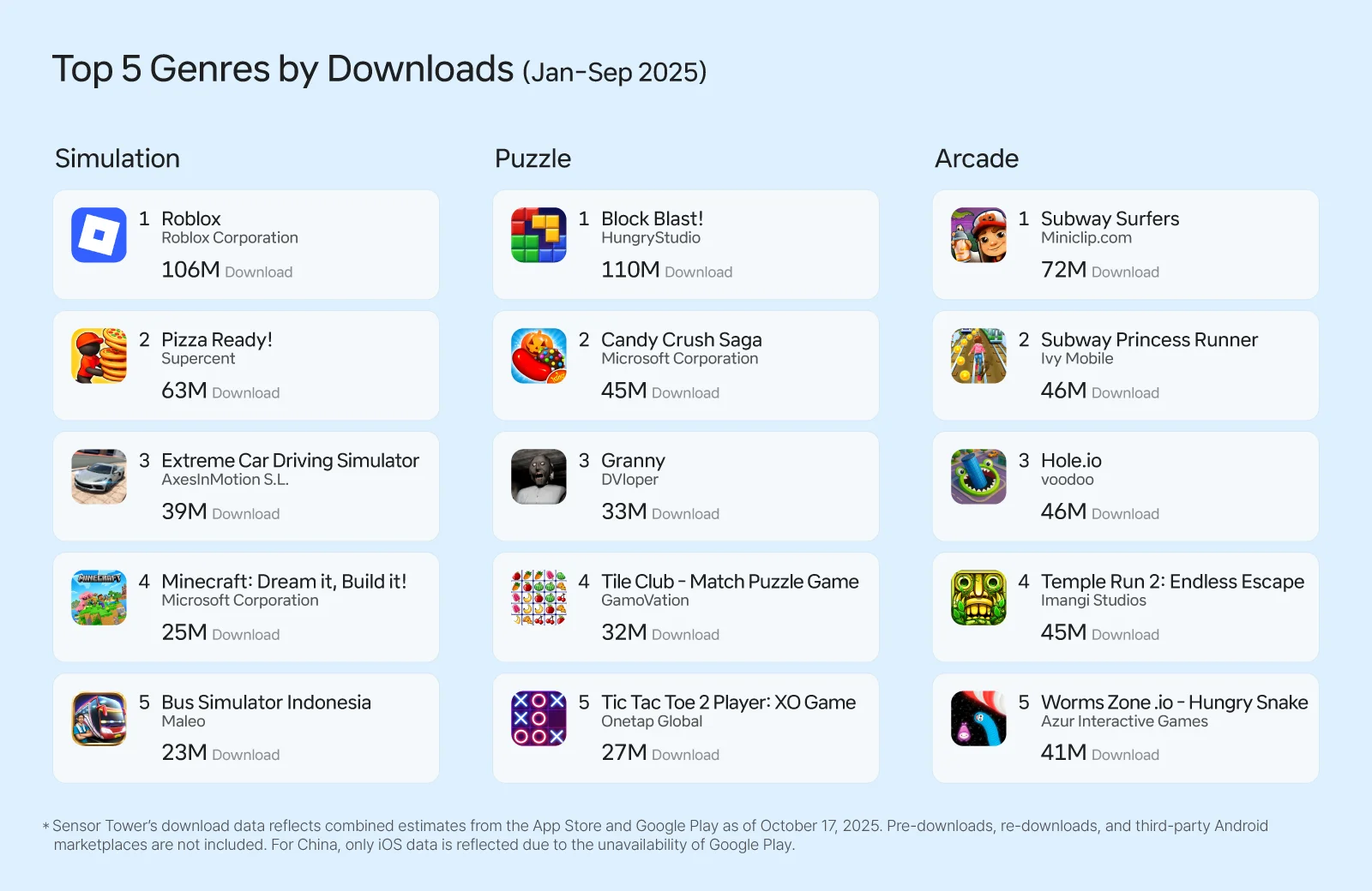 In the 2025 APAC mobile game market, the Simulation, Puzzle, and Arcade genres are leading downloads, each maintaining a double-digit share. Within the Puzzle genre, Block Blast recorded its highest-ever monthly downloads in 2025, driving overall genre's growth. In the Arcade category, Hole.io, originally released in 2018, has regained momentum by showing renewed growth this year.
