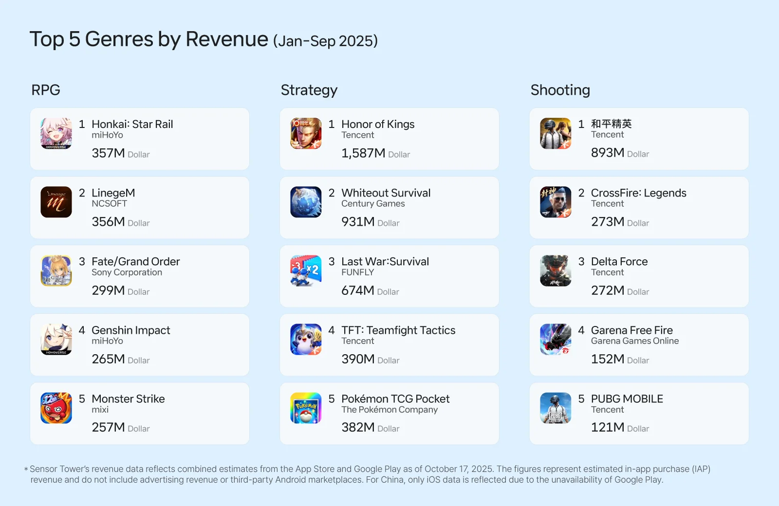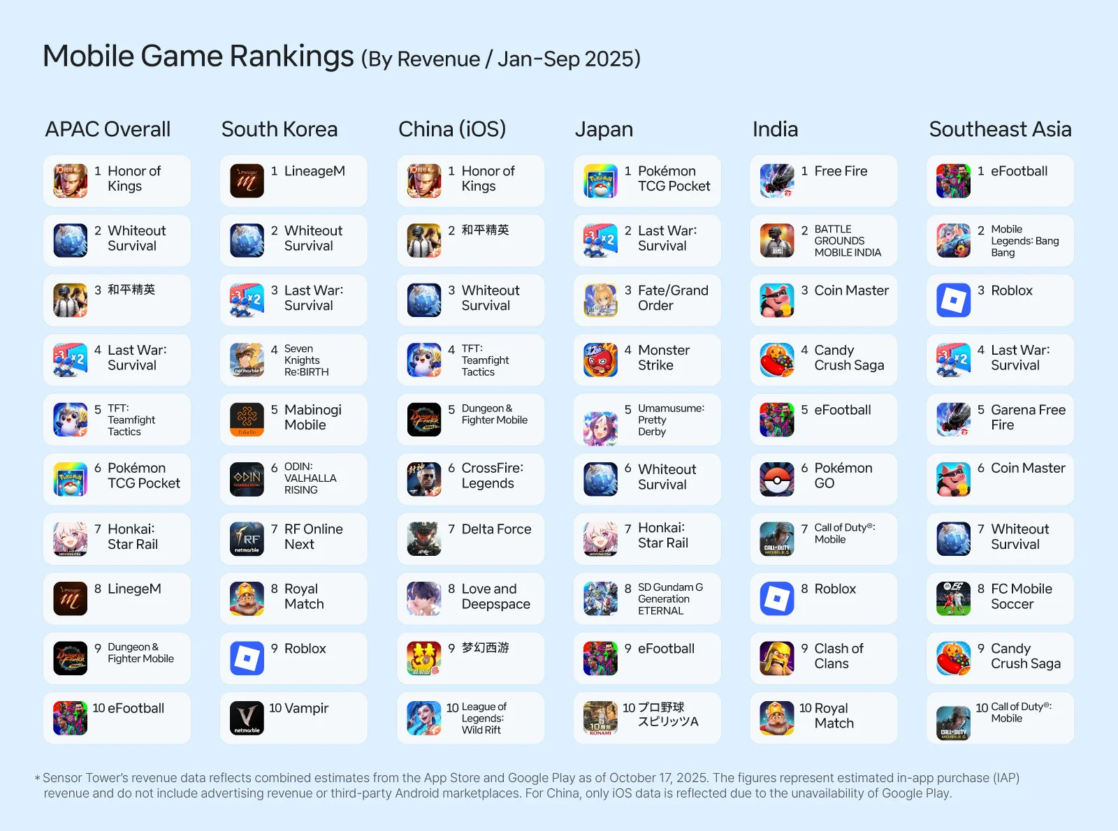 Honor of Kings and Game for Peace (和平精英) maintain a solid revenue performance in China, ranking #1 and #3 in APAC revenue. Meanwhile, Whiteout Survival achieved record-high monthly revenue in China, Korea, and Japan, solidifying its role as a leading example of strategy genre growth.