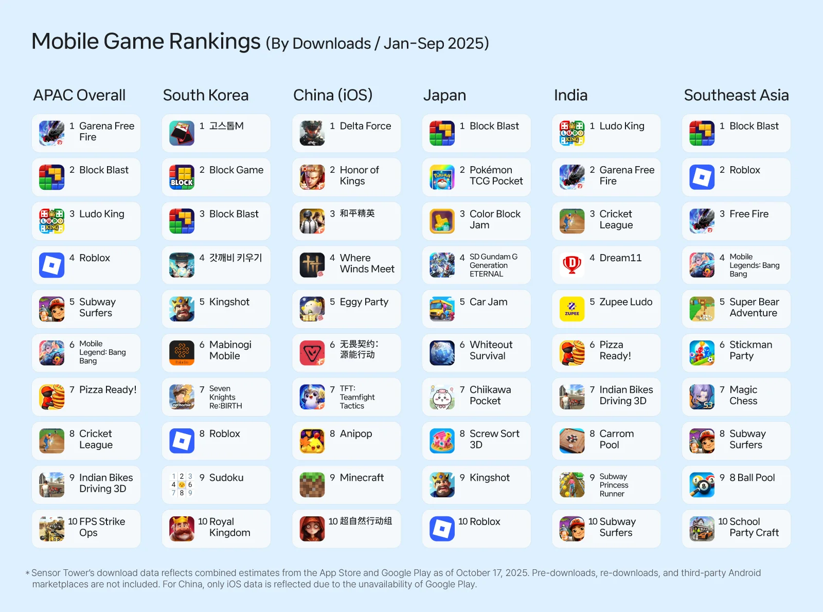 In South Korea, Japan, and China, domestically developed IP-based games continue to show strength, with representative local titles populating the top download ranks. These markets, supported by robust, independent game development ecosystems, exhibit a download structure distinct from the broader APAC trend.