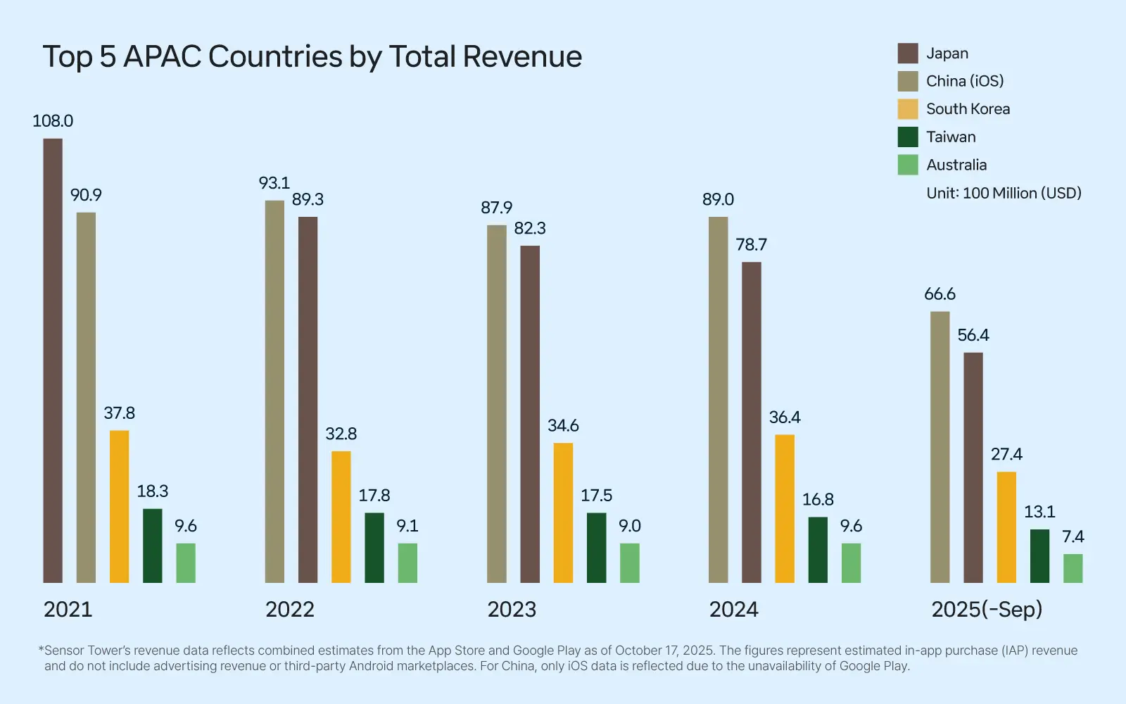 An analysis of country-specific revenue shows that China (iOS), Japan, and South Korea remain the core drivers in the APAC market, with Korea showing particularly strong growth compared to other markets.