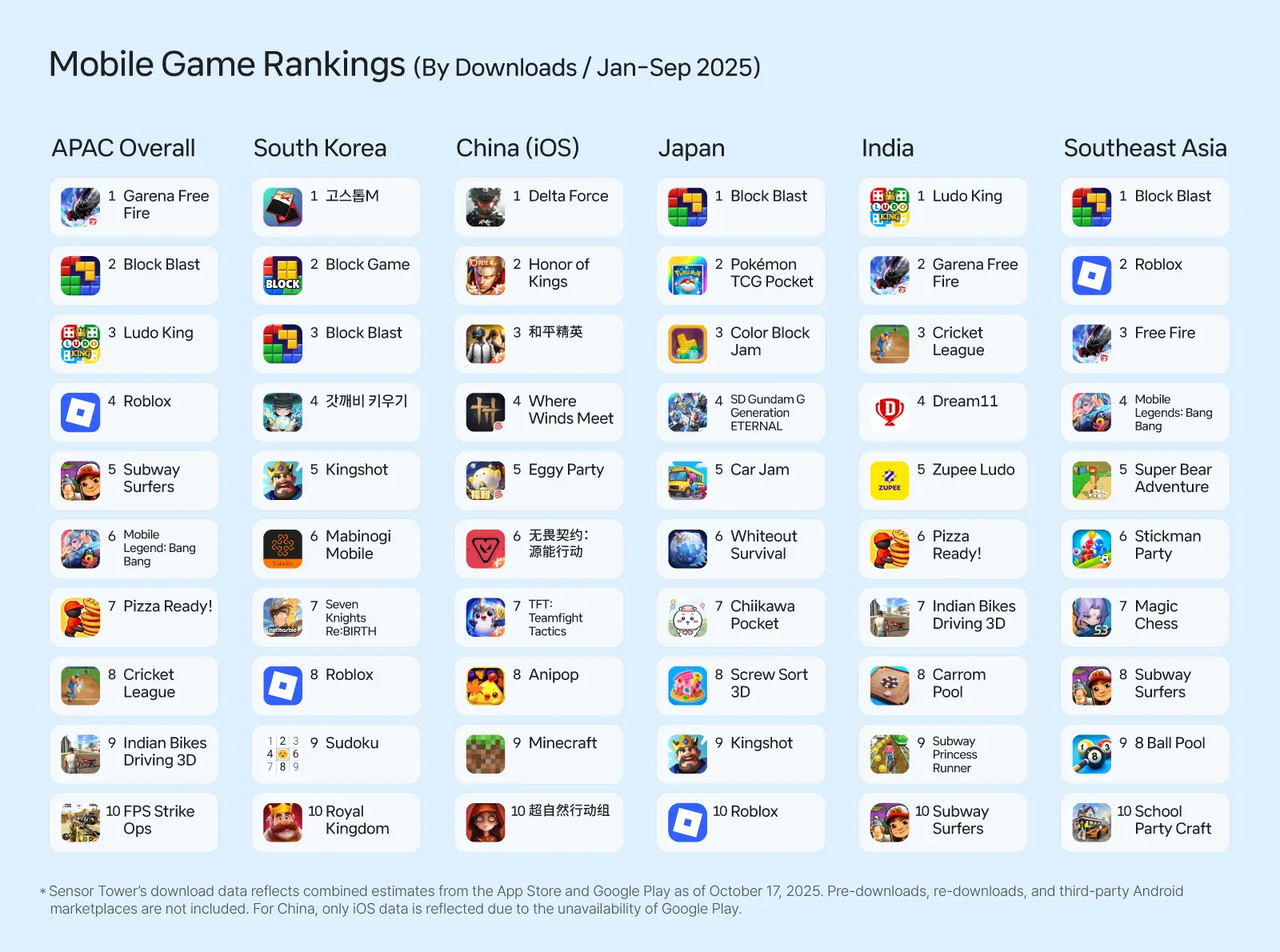 In India, Garena Free Fire and Battlegrounds Mobile India (BGMI) led revenue, positioning shooting games as the country’s core monetization category. eFootball also performed strongly across Japan, India, and Southeast Asia—the only sports title to enter APAC’s overall top 10.